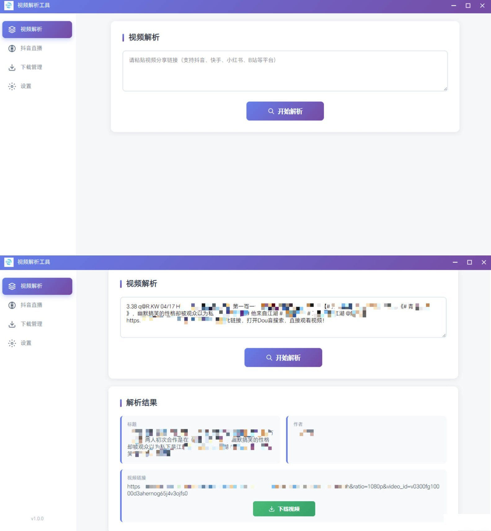 打开软件,在输入框右键粘贴链接,点击”开始解析”按钮